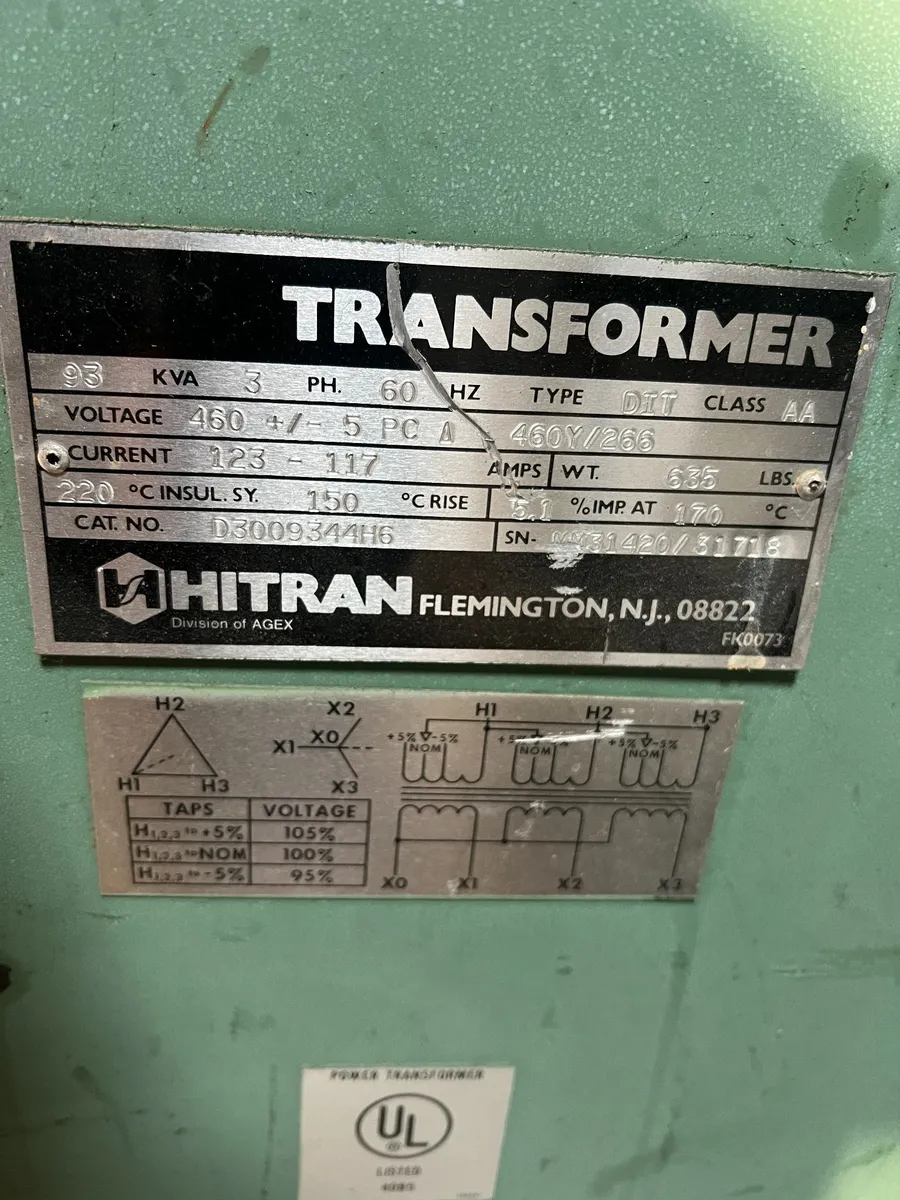 Hitran Model D3009344H6 93 KVA Transformer for sale. Converts 460V Delta primary to 460Y/266 secondary. Used condition. Ideal for industrial applications requiring reliable voltage transformation.